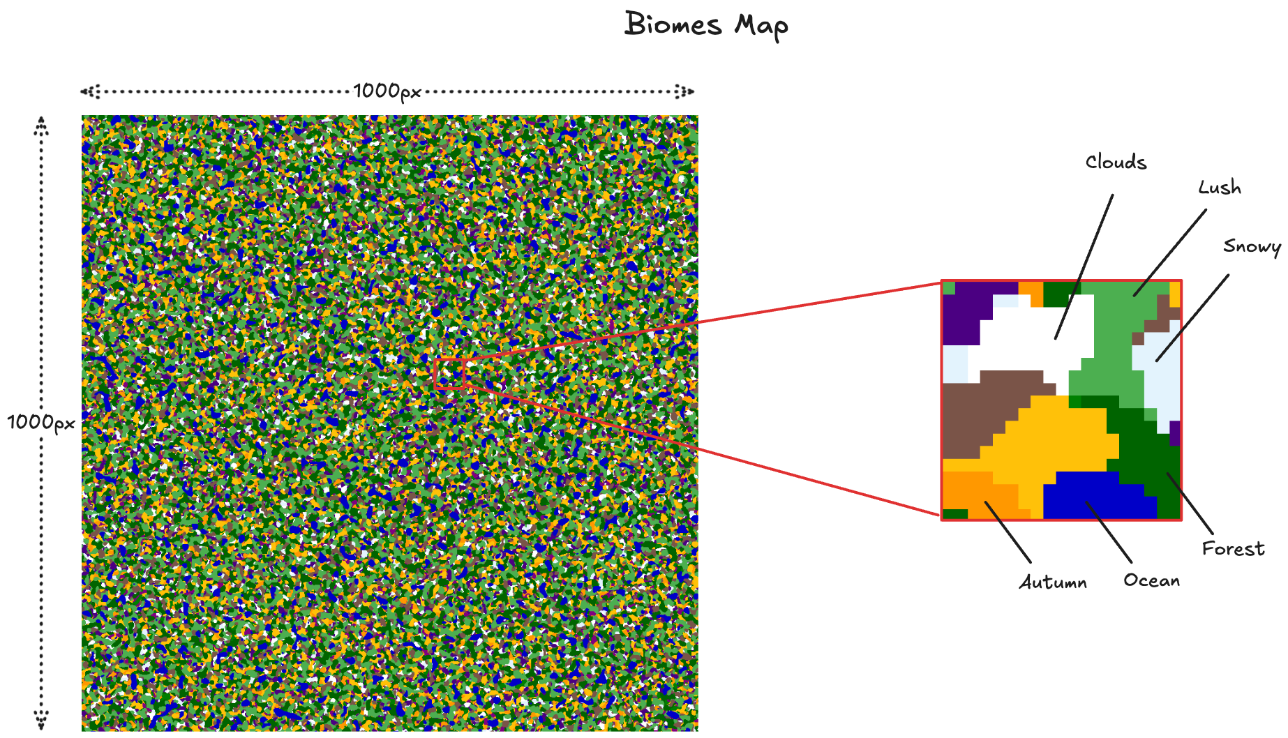 He created a Python script that generated a 1000x1000 image from Simplex noise. Each pixel of this image corresponds to one Biome in the canvas.
