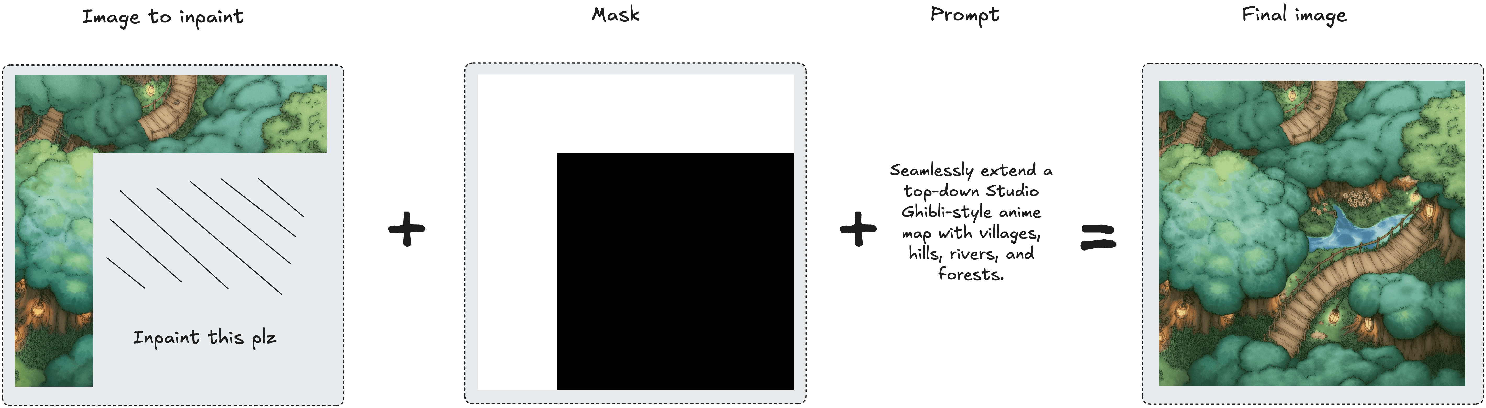 }A final prompt may look something like this: Extend the existing image as a world set in a mystical forest city hidden within gigantic, ancient trees. This part of the world has a prominent feature: A fantasy castle town.But… if the images are 1000x1000, doesn't that mean the canvas is only 1000x1000 too??? Technically, yeah—it's just one million cells. And BTW, generating that would cost me around $40k. But no worries. If the canvas ever even gets close to filling up, we'll just extend the maps procedurally. We could actually make it pretty much infinite.
