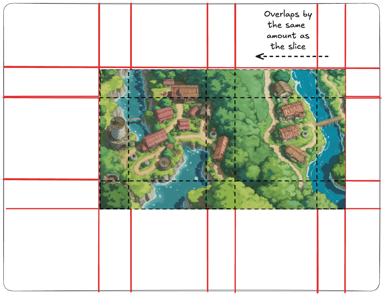 There will be more in-depth technical details on how I made it work at all with the small infra budget I had (see section: Loading an "infinite" image), but here I'll focus on the AI side. It comes down to three parts: AI inpainting, the grid system, and biomes.