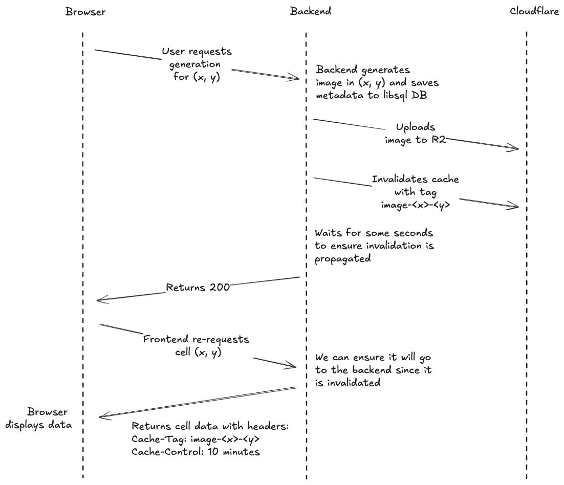 The read path is as we would expect, nothing special except for the Cache-Tag header that the server responds with. This is like an ID for Cloudflare, so I can later invalidate it.The write path is where the magic happens: As we know that a cell is updated only when a new image is generated, we invalidate at that moment the Cache-Tag in Cloudflare, so consecutive reads will be up-to-date.